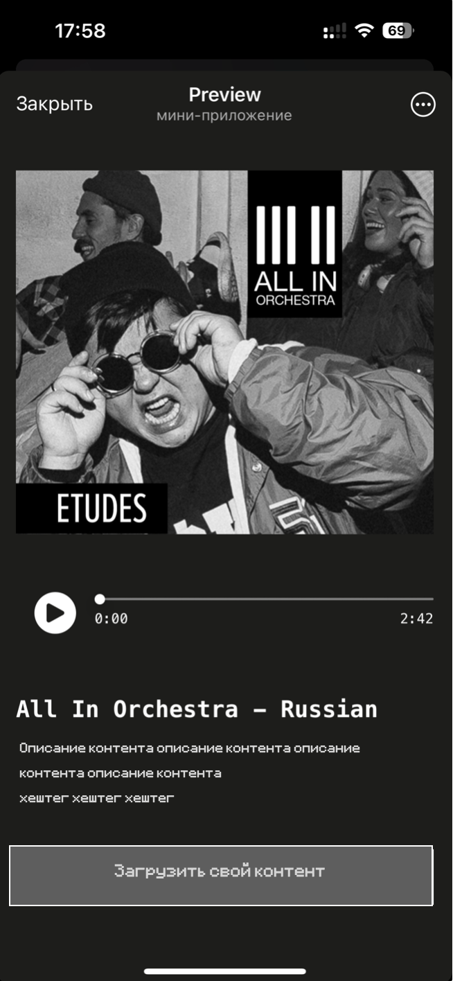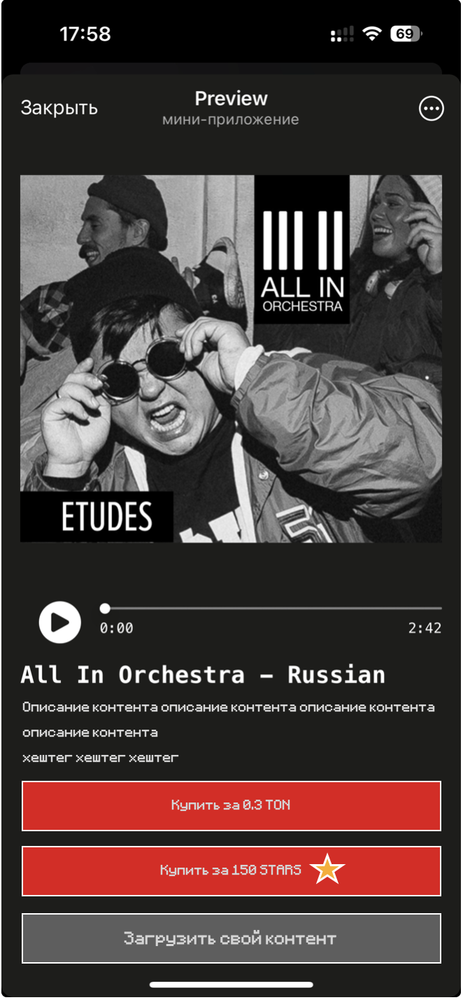 Кнопки на экране покупки и на экране купленного трека должны выглядеть вот так. Кнопка"загрузить свой контент" должна быть на сером фоне.